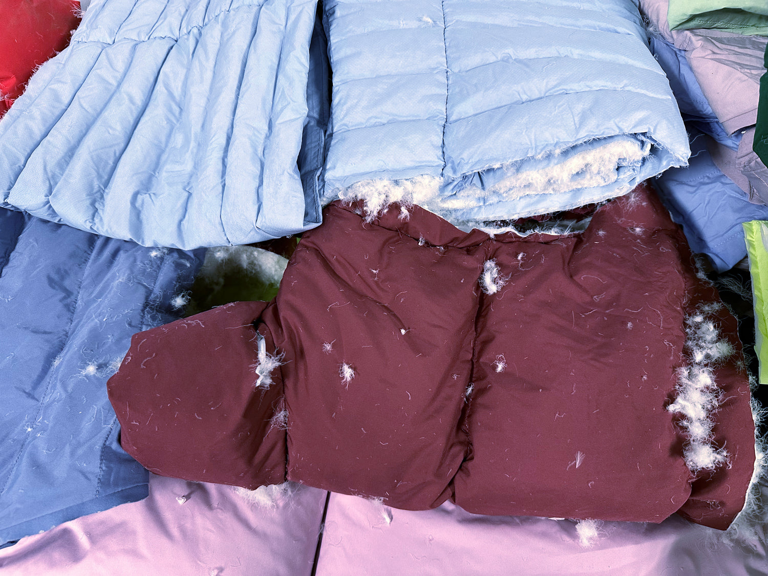 The sort happens before anything else. When down filled items come in for recycling, they first get sorted by brand. All the brands are kept separate. Under each brand, the species is sorted (goose and duck) then each of those for color (white and gray). This allows us to have a much higher quality of down and not mix up colors and species.